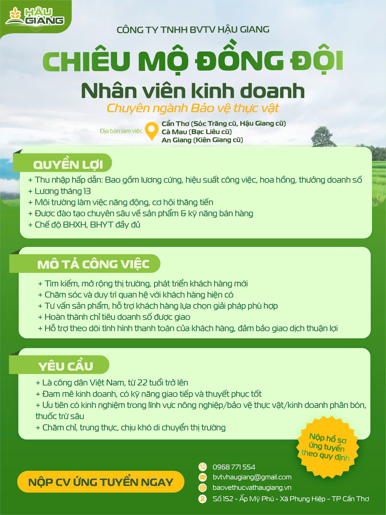 Công ty TNHH Bảo Vệ Thực Vật Hậu Giang chào đón những ứng viên nhiệt huyết gia nhập đội ngũ kinh doanh chuyên ngành BVTV tại các tỉnh miền Tây.